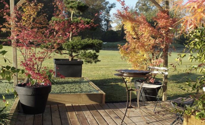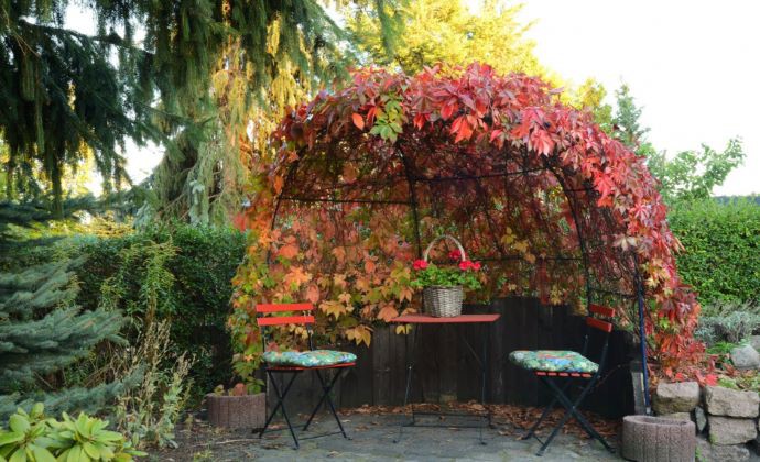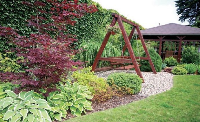 Javor dlaňovitolistý ´Bloodgod´ je farebne zladený s hojdačkou a altánkom.