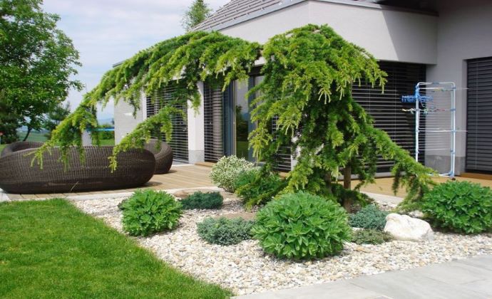 Hlavnú rolu záhrady dostala Borovica lesná ´Watererii´ z vystihaným kmeňom a zastrihnutou korunou do gule.