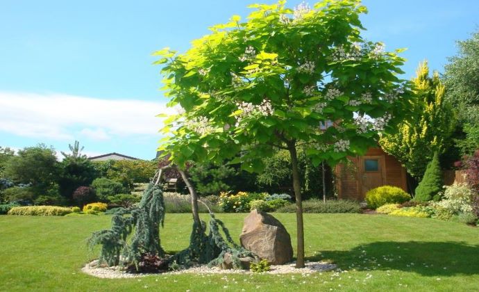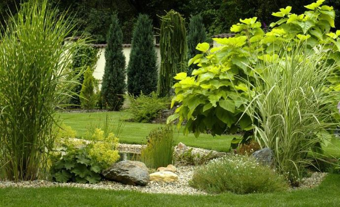 Jednoduché riešenie Katalpy , ozdobných tráv a trvaliek pri vodnom prvku.
