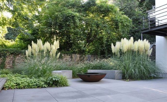 Obľúbená Pampová tráva, ktorá môže byť v krémovej a naružovelej farbe, je v tomto prípade vysadená ako solitér ohraničujúci ohnisko.