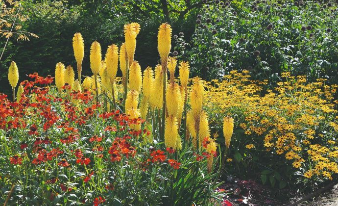 Kniphofia, prezývaná aj kleopatrina ihla alebo mnohokvet, je trváca a mrazuvzdorná rastlina, pochádzajúca z Južnej Ameriky. V popredí záhonu je Helenium autumnale.