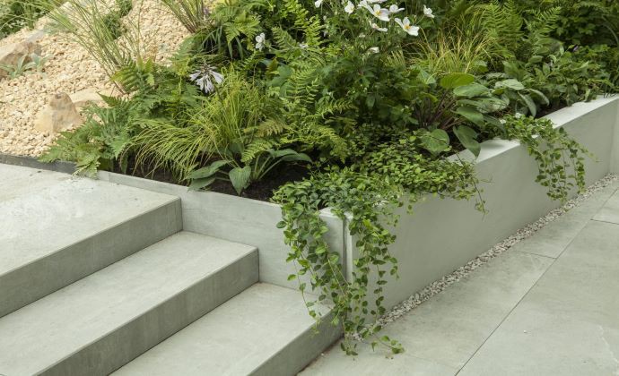 Bylinky sú osadené do záhonu s obrubou COR-TEN. Je to legovaná oceľ odolná voči atmosferickým vplyvom.