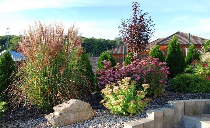Na malom priestore sú vysadené rôzne druhy trvaliek, ktoré vytvárajú plastickú štruktúru.