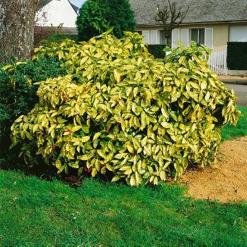 Sulphurea Marginata este o varietate cu adevărat unică de Aucuba japoneză. Nu este la fel de auriu sau galben ca majoritatea celorlalte și, deși frunzele sale poartă în mare parte nuanțe galbene, acestea arată mai subtil și mai elegant, în ciuda dimensiunilor lor enorme (până la 20x10 cm). Sunt veșnic verzi, foarte lucioase, de culoare verde mediu la mijloc și care devin verde deschis, galbene și chiar crem sau galben banană la margini. Sulphurea marginata crește lent sau moderat (20-25 cm pe an), formând un arbust dens de înălțime și lățime egale.