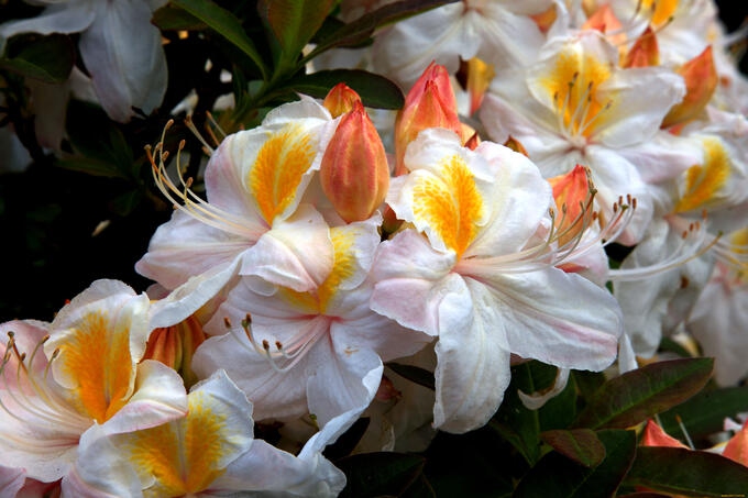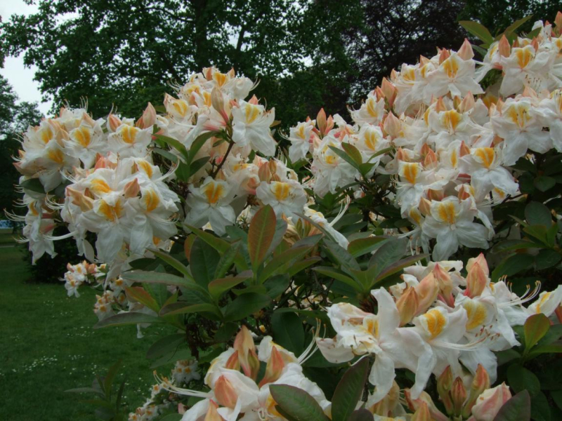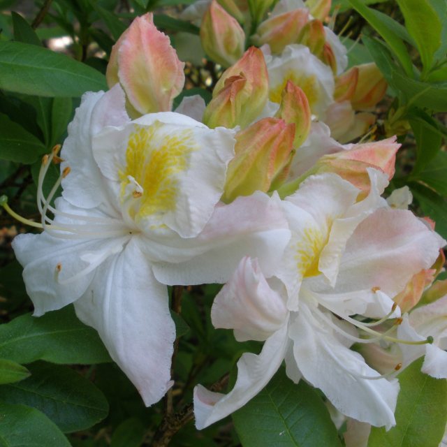 Azalee roz se deschid în flori mari albe cu o strălucire galben-portocalie izbitoare în mai-iunie. O minunată azalee cu frunze căzătoare care este parfumată și are o culoare bună de toamnă, cupru. Înflorește din mai până în iunie, crește până la 2 m. înălțime și aceeași lățime. Azaleele de foioase sunt plante de pădure care, spre deosebire de azaleele japoneze, iubesc soarele deplin, cu condiția să le oferim un sol constant umed, acid, cu un ph între 4 și 5. Ele preferă un sol ușor, necalcaros, permeabil, cu turbă, compost și un mulci lemnos de suprafață. Solurile grele sunt ușurate prin adăugarea de nisip și borax fin. Un drenaj bun este important în cazul solurilor argiloase grele. Tăiați ciorchinii de flori imediat după înflorire. Rădăcinile nu trebuie lăsate niciodată să se usuce.