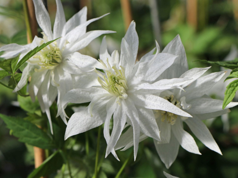 Clematis Albina Plena este o clematis excepțională cu o floare plină în formă de clopot. Ajunge până la 12 cm în diametru și ce mare plăcere - este o clematis remontant, adică cu înflorire repetată. Florile individuale sunt alb-crem, staminele sunt galbene. Înflorește în mai și mai târziu, la sfârșitul verii. Frunzele sunt de un verde intens și decorative, de 18 până la 20 cm.