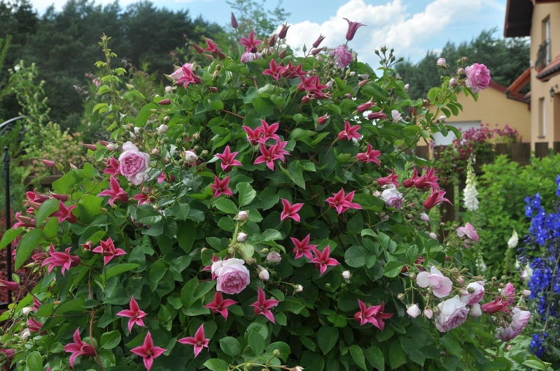 Clematisul Happy Diana este un clematis excepțional și rar, cu o singură floare în formă de clopot. Florile simple cu 4 petale au o culoare roz intens izbitoare și o dimensiune de până la 5-7 cm. Ele înfloresc de la începutul verii. Frunzele sunt de un verde intens și decorative. Clematis are nevoie de un suport în picioare, spalier, pergolă, perete structurat sau plasă de sârmă pe care să se cațere. Acest cultivar este originar din Japonia.
