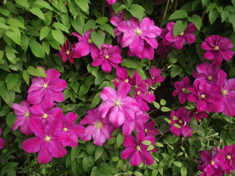 Clematis Sunset- o clematisă cu flori mari, de un roz intens, care va uimi cu profuzia sa uriașă de flori pe toată durata verii. Dimensiunea medie a florilor este de 10-12 cm. Petalele sunt late, uneori devenind purpurii.Clematis le place solul adânc și fertil, umiditatea și umbra pentru rădăcini. Plantați-le la umbră parțială sau în plin soare, cu alte plante plantate lângă rădăcinile lor pentru a le umbri rădăcinile și a menține astfel solul răcoros. Plantați plantele noi astfel încât partea superioară a sistemului radicular să fie încă la aproximativ 8 cm sub pământ, ceea ce va asigura formarea de noi rădăcini puternice, care nu se vor ofili. Cultivați cu mulci și adăugați puțin compost sau alt îngrășământ în fiecare an la sfârșitul iernii.
