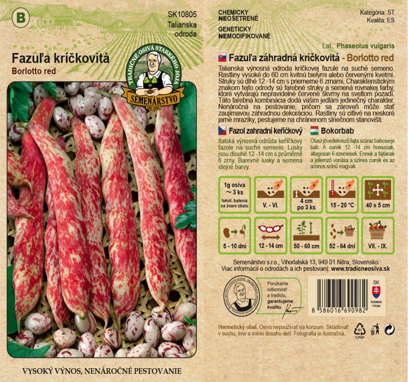 Varietate italiană cu randament ridicat de fasole boabe pentru semințe uscate. Plantele înalte de până la 60 cm înfloresc cu flori albe sau roșii. Păstăile au lungimea de 12 -14 cm, cu o medie de 6 boabe. Trăsătura caracteristică a acestui soi este păstăile colorate și semințele de aceeași culoare, care formează pete roșii neregulate pe un fond deschis. Această combinație de culori adaugă un caracter unic mâncărurilor dumneavoastră. Este ușor de cultivat și poate constitui, de asemenea, o decorațiune interesantă pentru grădină. Plantele sunt sensibile la înghețurile târzii de primăvară, creșteți într-o poziție adăpostită și însorită.