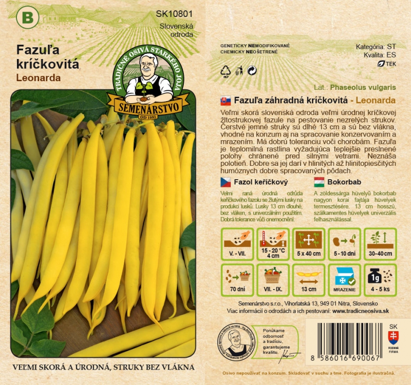Varietate slovacă foarte timpurie de fasole galbenă de tufă foarte fertilă pentru cultivarea păstăilor imature. Păstăile proaspete și fine au o lungime de 13 cm și sunt lipsite de fibre, potrivite pentru consum și pentru prelucrare prin conservare și congelare. Are o bună toleranță la boli. Fasolea este o plantă termofilă, necesitând o poziție mai caldă, mai adăpostită și protejată de vânturile puternice. Nu tolerează umbra parțială. Se dezvoltă în soluri argiloase până la argilo-nisipoase, humice, bine cultivate.