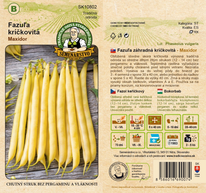 Un soi tradițional popular, mediu-timpuriu, stufos, cu o păstaie galbenă de lungime medie (12-14 cm), fără pergament și fără fibre. Este o plantă termofilă care necesită o poziție însorită, ferită de vânturi puternice. Nu tolerează umbra parțială. Semănat în sol deschis, în cuiburi de 3-4 semințe, într-un lăstar de 30 x 40 cm, sau individual, în rânduri de 5 x 40. Crește până la o înălțime de 40 cm. Boabele și păstăile sunt bogate în proteine, vitaminele A și E. Se folosește pentru consum direct, conserve și congelare.