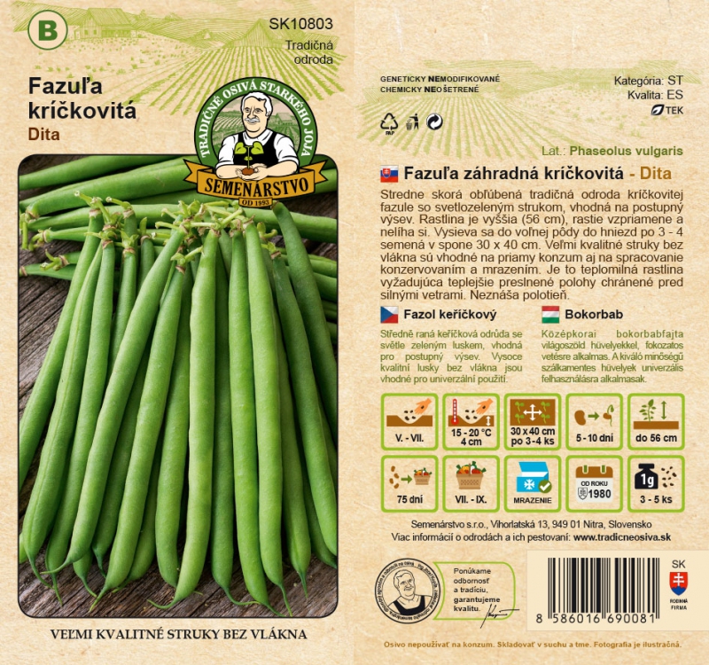 Varietate tradițională populară timpurie medie de fasole boabe cu păstăi verde deschis, potrivită pentru însămânțări succesive. Planta este mai înaltă (56 cm), crește în poziție verticală și nu se culcă. Se seamănă în sol deschis, în cuiburi de 3-4 semințe, într-un lăstar de 30 x 40 cm. Păstăile de calitate superioară, fără fibre, sunt adecvate pentru consumul direct și pentru prelucrarea prin conservare și congelare. Este o plantă termofilă care necesită poziții mai calde, însorite și ferite de vânturi puternice. Nu tolerează umbra parțială.