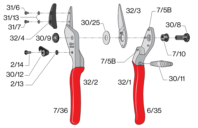 Felco 32 - pentru mâna mare, tăiate la un diametru de 25 mm, sunt concepute pentru a fi utilizate în principal în livezi, parcuri și grădini. Foarfecele are o contra lamă Amboss (nicovală). Capul de tăiere este ideal pentru tăierea copacilor care emit o cantitate mare de sevă atunci când sunt tăiați.