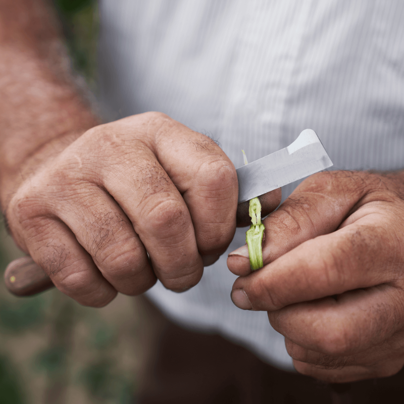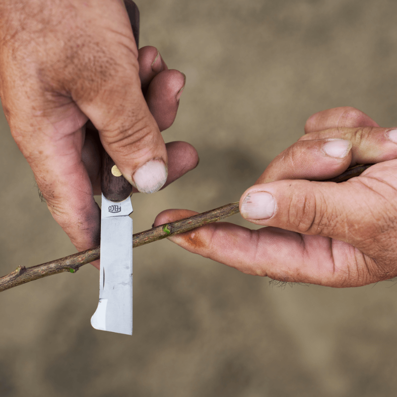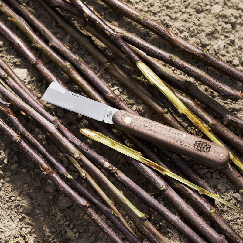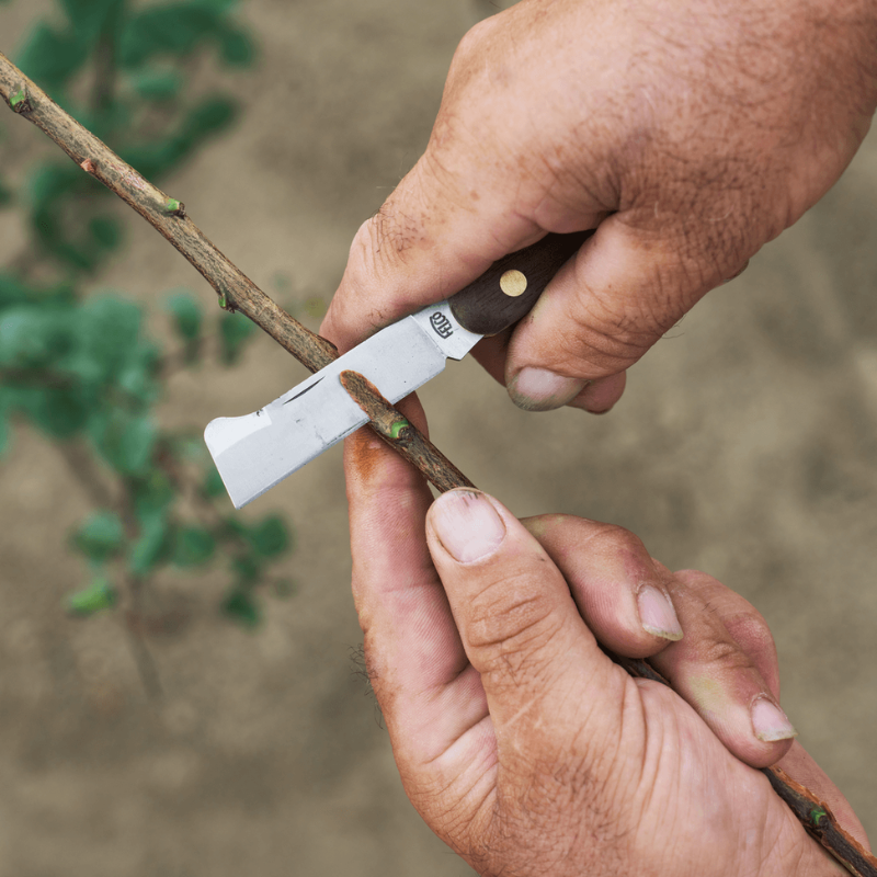 Cuțit profesional premium pentru altoit și altoit cu ridicător de scoarță pe partea superioară a lamei. Lamă din oțel carbon de înaltă calitate pentru o tăiere curată și precizie de neegalat la locul de muncă. Mâner din nuc. Căptușeala internă din alamă elimină și protejează lama de deteriorări.