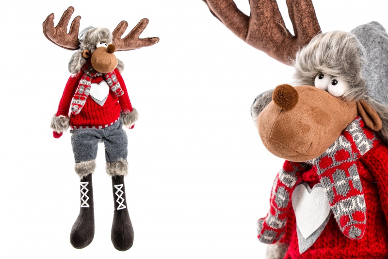 Mascotă ren cu haine de iarnă. Arată frumos sub bradul de Crăciun. Este un plus perfect pentru atmosfera festivă. Ideal și ca decor la ușa de la intrare. Înălțimea figurinei este de aproximativ 60 cm.