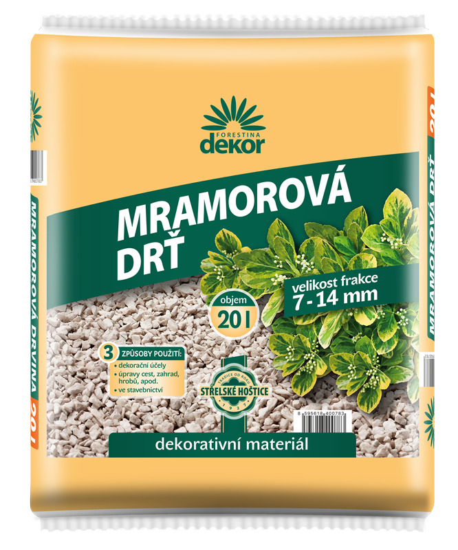 Forestina DEKOR așchii de marmură 7-14mm - 20l.Așchiile de marmură sunt potrivite pentru scopuri decorative interioare și exterioare. Poate fi folosit pentru amenajarea căilor, aleilor și a locurilor de reculegere sau pentru delimitarea zonelor din grădinile ornamentale. De asemenea, servește ca decor pentru containere și ghivece de terasă. Fracție: 7 - 14 mm. Ingrediente: pietricele de marmură albă zdrobită