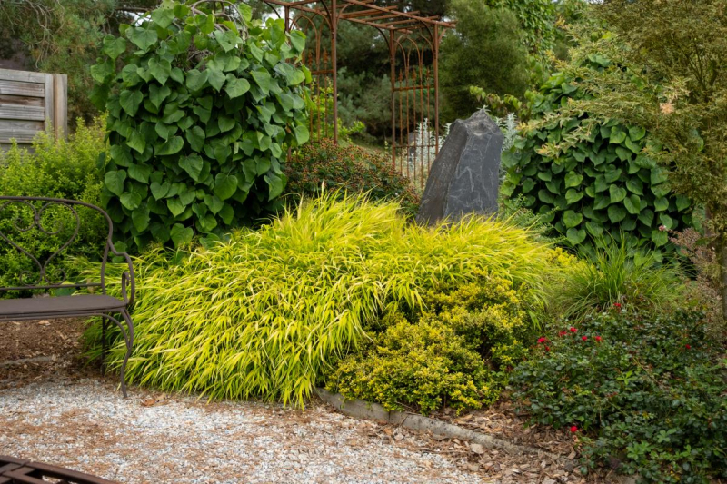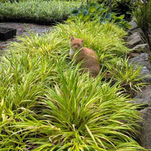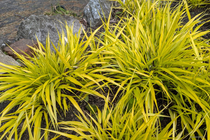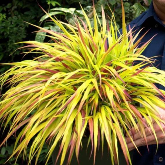 Hakonechloa macra Sunflare este un cultivar cu frunziș galben, care devine roșu la vârfuri toamna. Florile verzi sunt delicate și apar la sfârșitul toamnei timpurii. Este ideală pentru a fi folosită în copacii de subarboret, în straturi și în stâncării. În Japonia este, de asemenea, o plantă valoroasă în containere. produce tufe cu creștere lentă, cu frunze largi, căzătoare. Un mic dezavantaj al acestei ierburi este că se ofilește iarna, dar când este tăiată până la pământ primăvara, ne răsplătește cu frunze noi în primăvară. Crește până la o înălțime de aproximativ 40 cm și o lățime de 40 cm. Este rezistentă la înghețuri de până la -20 grade Celsius.