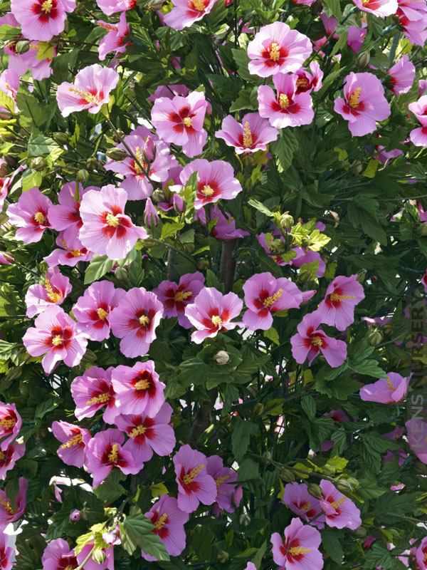 Aphrodite poartă flori foarte mari de culoare roz aprins, cu un ochi mai mic burgund în mijloc. Face muguri destul de mari și creșteri. Foarte atractivă.