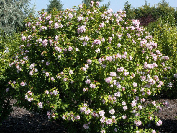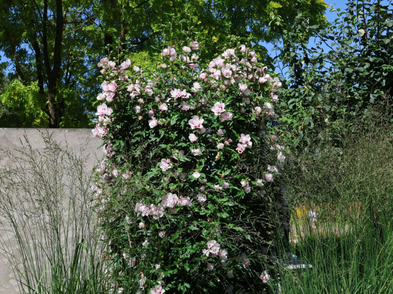 Lady Stanley este un hibiscus cu flori roz pal cu nervuri roșu burgundy.