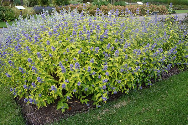 HINT OF GOLD oferă o colorare deosebit de atractivă a frunzelor. Acestea sunt vizibil mai mari , oferind o diversiune binevenită în straturile cu arbuști joși și conifere de culoare verde închis. Sunt foioase, ciudat de aromate și cu frunze fine la atingere. Florile apar de la jumătatea verii până la jumătatea toamnei și sunt grupate frumos în straturile superioare ale tulpinii și la vârful acesteia. Florile sunt de culoare violet mediu și sunt mici tuburi care adăpostesc o abundență de nectar pentru bondari, fluturi și alte delicii similare care asediază arbustul din zori până în amurg.