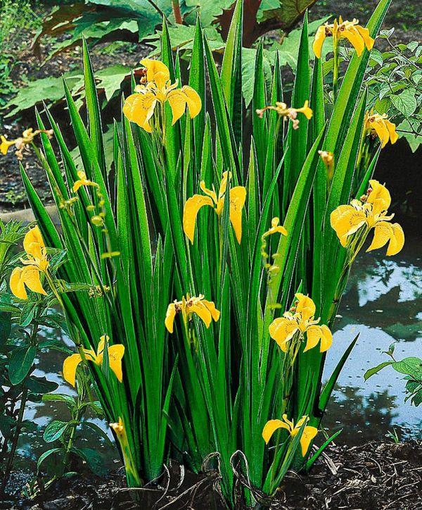 Iriza galbenă, este o plantă perenă care crește în toată Europa, pe malurile iazurilor și în locuri înnămolite. Face parte din familia Iridaceae - Irisul. Cultivarul "Variegata" este un iris magnific, cu frunze interesante, galbene, care înfrumusețează planta pe tot parcursul sezonului de creștere și nu cad pentru iarnă. Produc flori de un galben strălucitor, cu nervuri maro în centru, din mai până în iulie. Acestea sunt mari de 10 cm. Întreaga plantă crește până la o înălțime de 70-80 cm. Irisul galben preferă un loc însorit, dar poate tolera și umbra parțială. Solul este potrivit umed până la inundat și bogat în nutrienți. Poate fi plantat într-un iaz, în apă stătătoare sau care curge ușor, până la o înălțime de 5-15 cm. Este neprețuită în eliminarea compușilor azotați din apă, prevenind astfel creșterea excesivă a algelor. Nu are nevoie de protecție pentru iarnă.