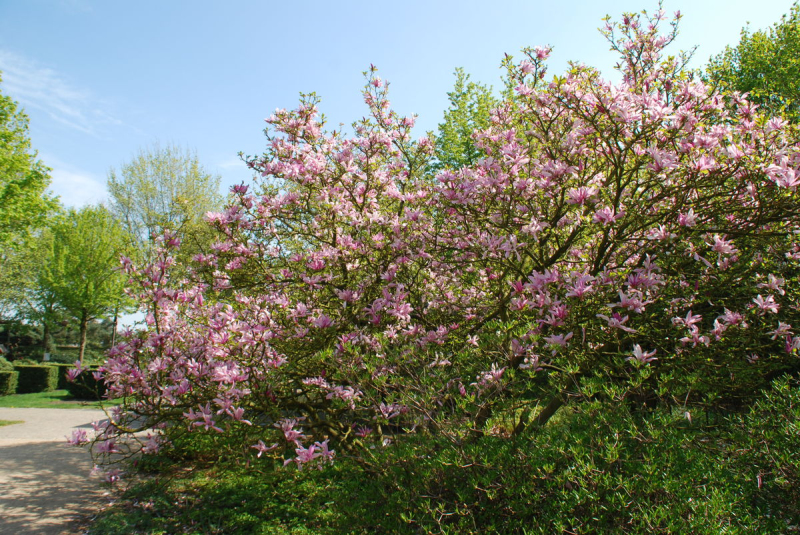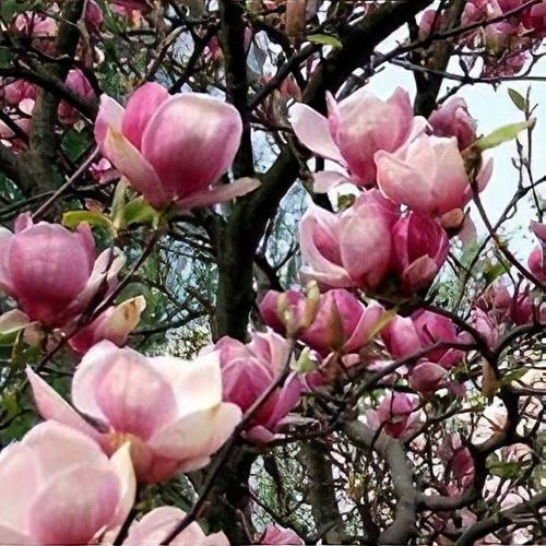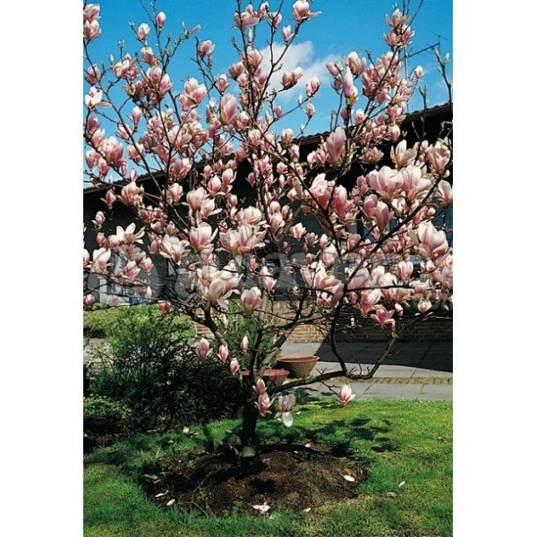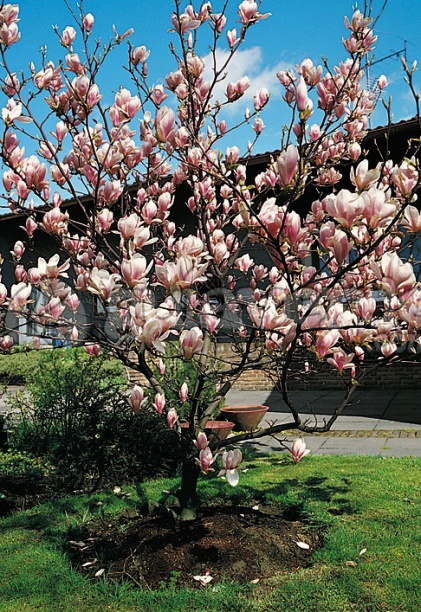 Magnolia Satisfaction - un hibrid de magnolie roz pal. Florile roz, care miros plăcut, sunt așezate de-a lungul ramurilor. Înflorește primăvara înainte de apariția frunzelor. Frunzele sunt lucioase, de culoare verde închis.