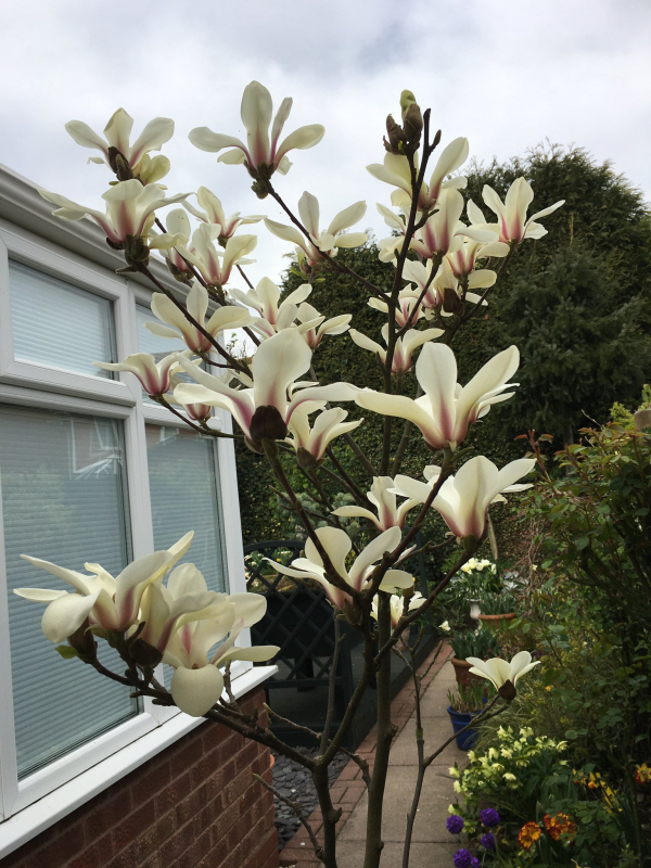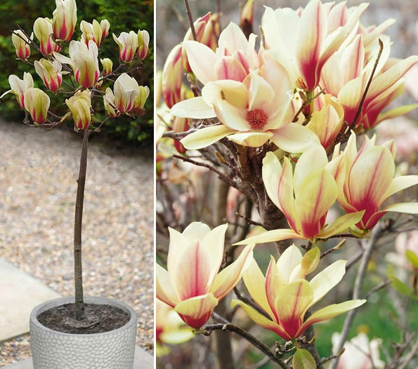 Florile superbe în formă de cupă ale Magnoliei Sunrise sunt albe la interior, crem spre gălbui la exterior, decorate cu o flacără de roșu care vine de la bază. Frunzele sunt caduce, de un verde strălucitor.