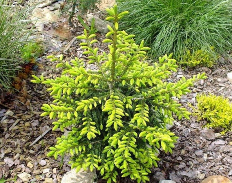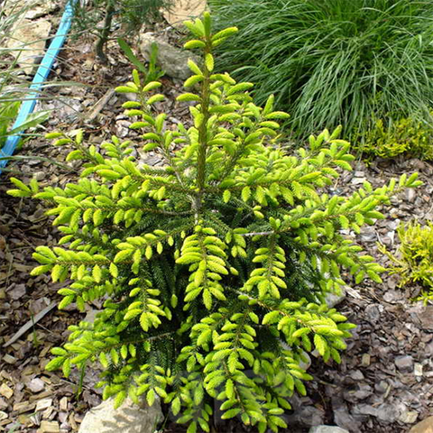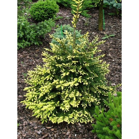 Este larg conic, spicele sunt fine, scurte, galbene la înmugurire, ulterior întunecându-se la verde. Preferă o poziție umedă, însorită și un sol bine drenat. Acest molid pitic se potrivește cel mai bine ca solitar în spații mici, grădini din față sau ca element dominant în stâncării sau lanuri.