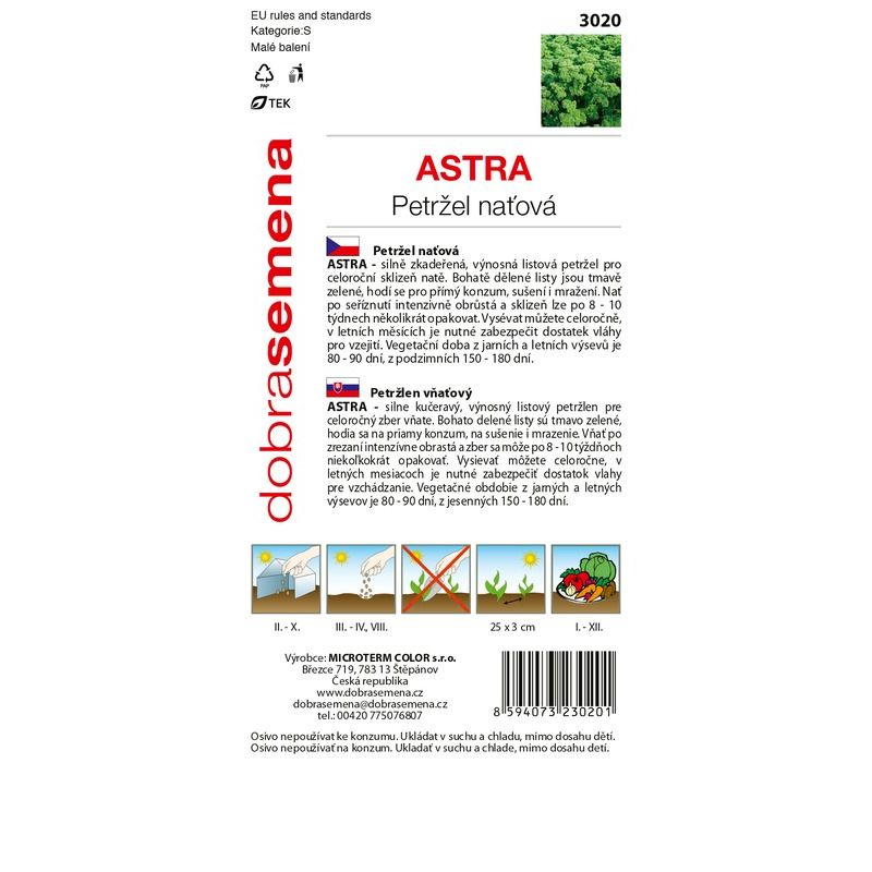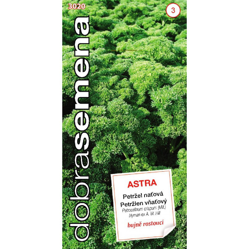 ASTRA - perejiu cu frunze puternic crețe, cu randament ridicat pentru recoltarea de crenguțe tot timpul anului. Frunzele bogat divizate sunt de culoare verde închis, potrivite pentru consum direct, uscare și congelare. După tăiere, crenguța crește înapoi viguros și poate fi recoltată de mai multe ori după 8-10 săptămâni. Semănatul se poate face pe tot parcursul anului, dar în lunile de vară este necesar să se asigure suficientă umiditate pentru ca plantele să crească. Perioada de vegetație de la însămânțările de primăvară și vară este de 80-90 de zile, iar de la însămânțările de toamnă de 150-180 de zile. Distanța de creștere recomandată este de 20 x 3 cm.