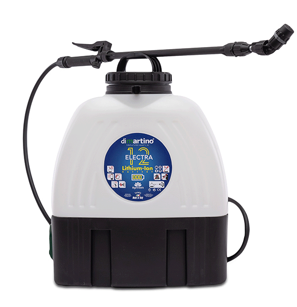 Aspersor electric potrivit pentru viticultori, grădinari și pomicultori. Este potrivit pentru stropirea copacilor datorită performanței sale - rază de acțiune de până la 4,5 m. 5 / 6 bar. Pulverizatorul este furnizat cu o baterie Li-ion de 12 V de 7,2 Ah, cu o pompă cu micro-membrană (debit max.: 3 litri min.), care permite atingerea unei valori de 5 bar în timpul utilizării. Are un regulator electronic de presiune și un indicator care vă permite să verificați nivelul de încărcare al bateriei. Datorită presiunii, are o pulverizare constantă eficientă și de lungă durată. Timpul de pulverizare este de până la 8 ore, este nevoie de 4 ore pentru a se încărca.