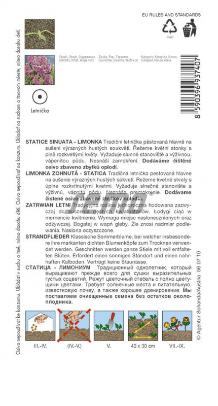 Anuale drepte, dens ramificate, destinate în principal uscării. Formează o rozetă care crește la sol, cu frunze lobate lanceolate și flori mici în inflorescențe dense pe tulpini înaripate. Tulpinile de flori se recoltează treptat (complet înflorite) și se usucă la umbră. Florile proaspete pot fi folosite și pentru tăierea în vaze. Necesită un habitat complet însorit și înflorește slab la umbră parțială. Nu tolerează îmbibarea cu apă. Roz, înălțime 80 cm.
