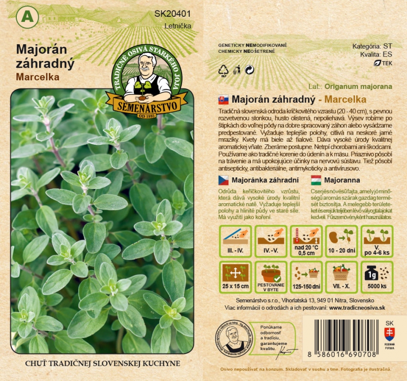 Varietate slovacă tradițională de creștere arbustivă (20 - 40 cm), cu o tulpină puternic ramificată, cu frunze dense, nu cățărătoare. Se însămânțează prin ciupire în sol afânat, într-un pat bine pregătit sau se plantează înainte de creștere. Necesită poziții mai calde, sensibil la înghețurile târzii de primăvară. Florile sunt albe până la violet. Produce randamente mari de frunze aromatice de înaltă calitate. Se recoltează treptat. Nu suferă de boli sau dăunători. Îl folosim ca condiment tradițional pentru cârnați și carne. Este bun pentru digestie și are un efect calmant asupra sistemului nervos. De asemenea, este antiseptic, antibacterian, antifungic și antiviral.