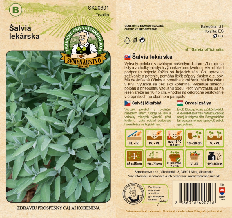 Perennial semi-evergreen cu frunze ovale cenușii. Frunzele și vârfurile lăstarilor tineri se recoltează înainte de înflorire. Ca cataplasmă, favorizează vindecarea rănilor greu vindecabile. Ceaiul reglează digestia și transpirația și ajută la tratarea gingivitei și a infecțiilor dentare. Are efecte dezinfectante și ajută la scăderea nivelului de zahăr din sânge. Este folosit și ca condiment. Are nevoie de o poziție însorită și de un sol aerisit și permeabil. Se taie la 10-15 cm toamna pentru a preveni înghețul. Potrivit pentru cultivarea pe tot parcursul anului în ghivece pe pervazul ferestrei.