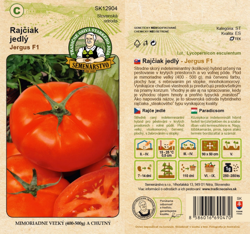 Hibrid mediu timpuriu nedeterminat (pin) pentru cultivare în interior și exterior. Fructul este extrem de mare (400-500 g), de culoare roșie, de formă plată, cu nervuri la nivelul pedunculului, cu mai multe camere. Caracteristicile sale gustative excelente îl fac deosebit de potrivit pentru consumul direct. Cu toate acestea, este potrivit și pentru prelucrare, unde avantajul constă în volumul masei și în "carnația" sa tipică. După cum sugerează și numele, este un soi slovac de tomate hibride "tip friptură" de calitate excelentă.