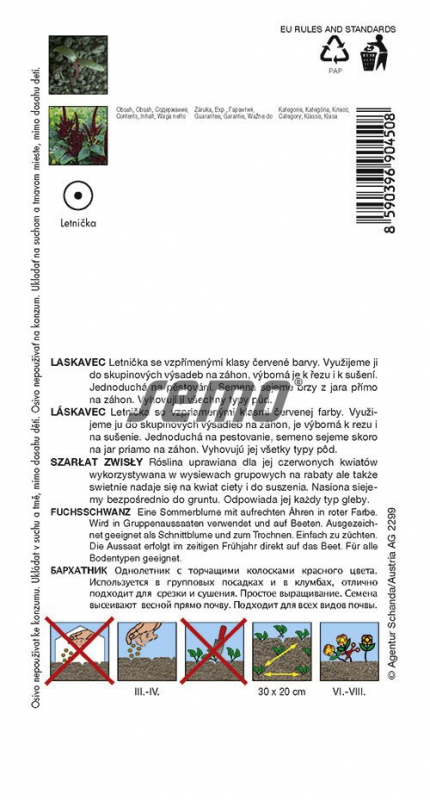 O plantă anuală cu creștere rapidă, cu vârfuri de flori verticale de culoare roșu intens. Excelentă pentru straturi mixte de flori, tăieri, vase și uscare. Se însămânțează direct pe parcelă, în mod excepțional este posibilă preînmulțirea răsadurilor. Salcâmul nu este pretențios în ceea ce privește habitatul, i se potrivesc solurile umede, care rețin suficient apa și soarele deplin. Crește până la o înălțime de 40 - 60 cm.