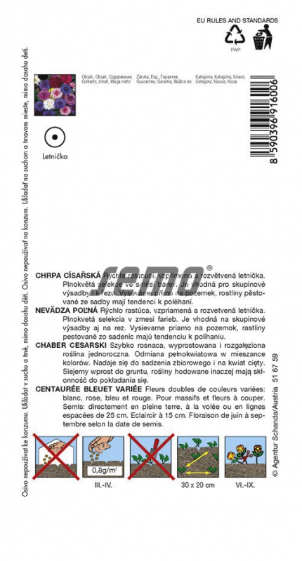 O plantă anuală cu creștere rapidă, verticală și puternic ramificată. Frunzele sunt lanceolate, înguste, gri-verzui. Este potrivită pentru plantarea în grup și pentru tăiere. Rezistă 10 zile în vază. Semănați direct în parcelă, plantele crescute din semințe au tendința de a se depune. Un amestec de flori albe, albastre, roz și purpurii pline, 90 cm înălțime.