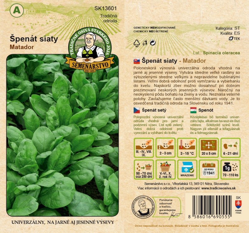 Varietate versatilă cu randament semitârziu, potrivită pentru însămânțarea de primăvară și toamnă. Produce plante de mărime medie, cu frunze de culoare verde închis, de mărime medie și cu bule neregulate. Rezistență foarte bună la îngheț și înroșire până la înflorire. Cea mai timpurie recoltă poate fi obținută cu o bună iernare a plantelor semănate toamna târziu. Necesită un sol neacidificat, bogat în substanțe nutritive și apă. Nu tolerează pozițiile vântoase. Se irigă frecvent cu doze mai mici de apă. Este un soi tradițional bine stabilit, cultivat în Slovacia din 1941.