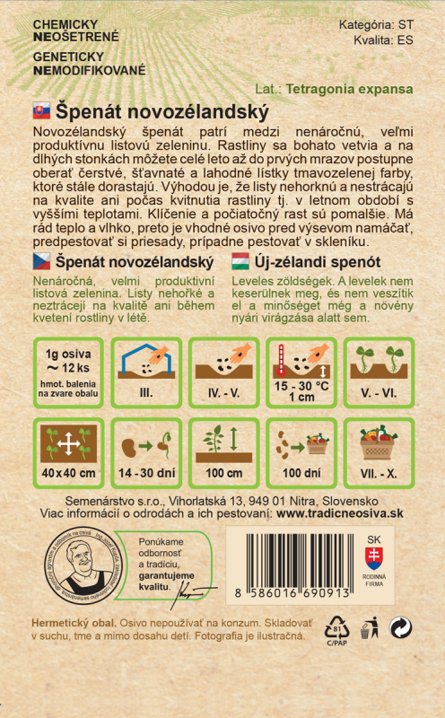Spanacul din Noua Zeelandă este una dintre cele mai nepretențioase legume cu frunze, foarte productivă. Plantele se ramifică abundent, iar tulpinile lungi pot fi recoltate treptat toată vara până la primele înghețuri, producând frunze proaspete, suculente și delicioase, de culoare verde închis, care sunt încă în creștere. Avantajul constă în faptul că frunzele nu devin amare și nu își pierd calitatea nici atunci când planta înflorește, adică în perioada de vară cu temperaturi mai ridicate. Germinarea și creșterea inițială sunt mai lente. Îi plac căldura și umiditatea, de aceea se recomandă înmuierea semințelor înainte de însămânțare, pre-creșterea răsadurilor sau cultivarea într-o seră.