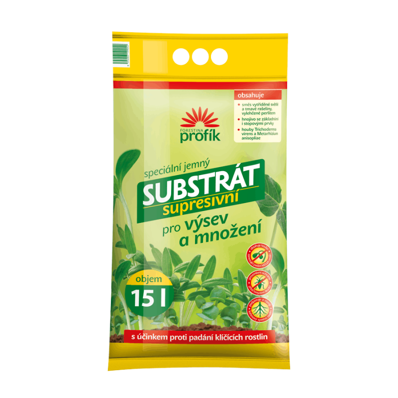 Substratul de însămânțare supresiv este conceput special pentru însămânțarea și înmulțirea plantelor. Este potrivit atât pentru însămânțare, cât și pentru înțeparea butașilor de plante. Substratul este îmbogățit cu îngrășământ cu nutrienți esențiali și oligoelemente în intervalul necesar, care are un efect pozitiv asupra înrădăcinării fără probleme a butașilor și a germinării plantelor. Substratul este îmbogățit cu ciupercile Trichoderma virens și Metarhizium anisopliae, care asigură puritatea substratului. Ciuperca Trichoderma virens, care suprimă în mod activ agenții cauzali ai bolilor fungice importante, inclusiv ciupercile fitopatogene din genurile Fusarium, Pythium, Sclerotinia, Rhizoctonia. Aceste ciuperci fitopatogene provoacă înrădăcinarea și moartea plantelor germinate și emergente și de aceea utilizarea unui substrat de însămânțare îmbogățit cu un organism antagonist reprezintă un element preventiv important în protecția răsadurilor. în același timp, prezența acestei ciuperci are un efect benefic asupra înrădăcinării și dezvoltării plantelor, plantele răspund la prezența acestui oragnism prin inducerea așa-numitei rezistențe induse, adică o stare de rezistență crescută la o gamă largă de organisme dăunătoare. De asemenea, este îmbogățit cu ciuperca Metarhizium anisopliae, care constituie o prevenire eficientă împotriva insectelor care dăunează plantelor germinatoare și transpirante. Obiectivul principal al inoculării deliberate a substratului cu acest organism benefic este de a proteja răsadurile diferitelor specii de răsaduri și plante ornamentale împotriva dăunătorilor care atacă sistemul radicular al plantelor. De exemplu, împotriva larvelor de viermi sârmă, larvelor de scabie, greierilor cârtiță,... În plus față de speciile de dăunători care apar exclusiv în sol, efectul ciupercii asupra insectelor dăunătoare care își desfășoară doar o parte din dezvoltare în sol (de exemplu, gărgărițele) este, de asemenea, semnificativ. nu expuneți substratul la lumina directă a soarelui (temperaturi ridicate) și depozitați-l într-un loc întunecos și răcoros. volumul de umplere este de 15 litri.