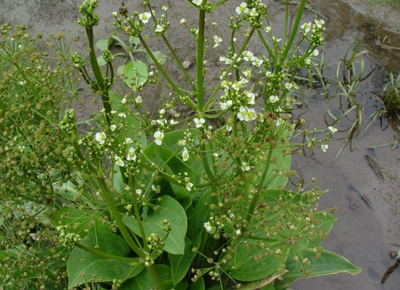 Planeta este recunoscută după rozeta largă de frunze în formă de lingură. Are inflorescențe rare, înalte deasupra frunzelor. Florile sunt de culoare roz deschis până la alb. Plantainul înflorește în iulie-august, iar planta poate crește până la un metru înălțime. Este potrivită pentru zonele joase și mlăștinoase cu o adâncime de 5 - 30 cm.