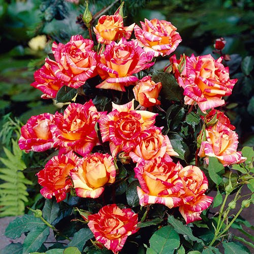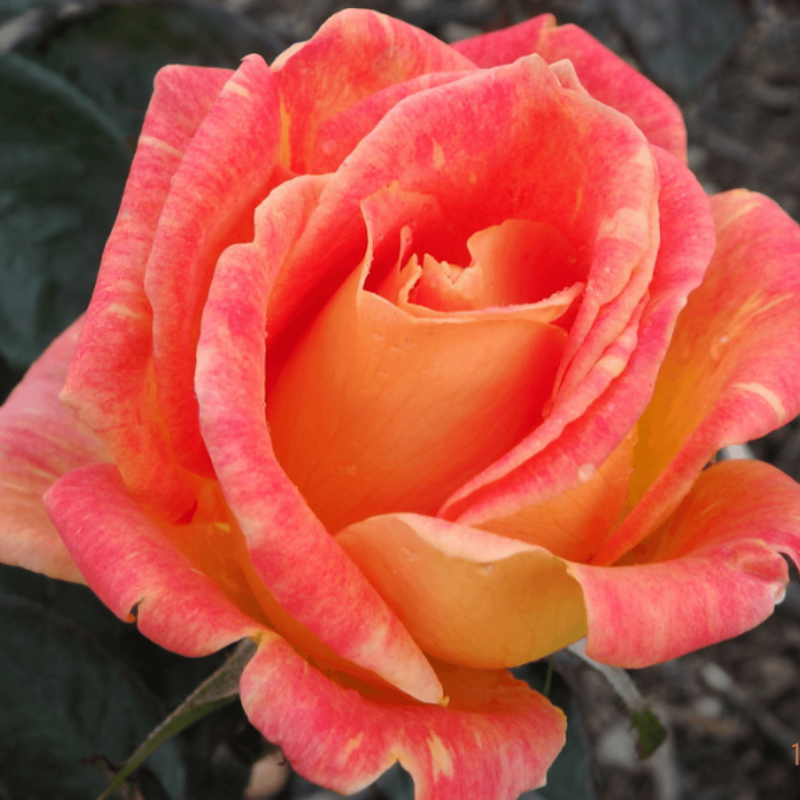Rosa Harry Wheatcroft - o frumoasă trandafiră cu floare plină, de culoare roșu coral cu marcaje galben auriu.