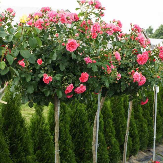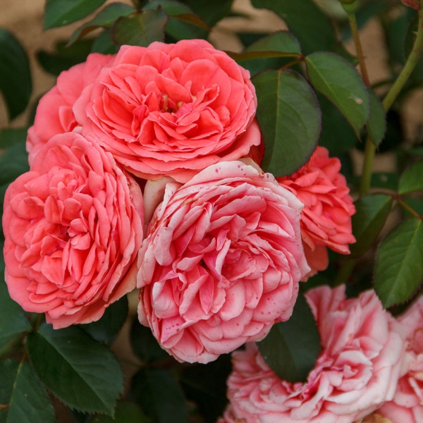 Florile sunt frumos pline și dense într-un roz antic cu un aspect romantic. Arbustul înflorește abundent.