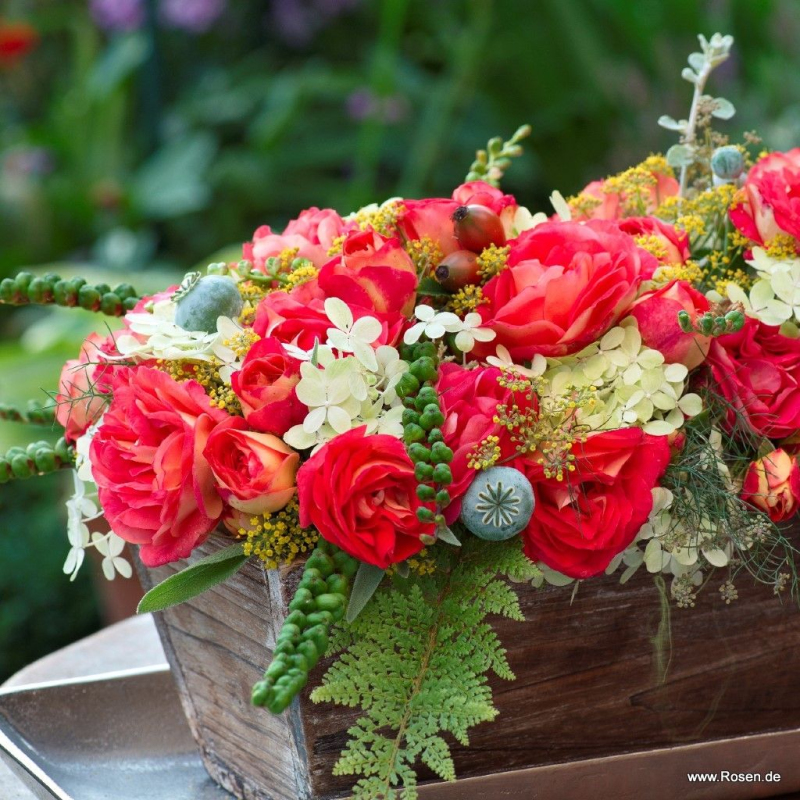 Trandafirul nostalgic cu flori multiple ´GEBRÜDER GRIMM´ este interesant pentru efectul său cromatic. Colorarea părții inferioare a petalelor în tonuri portocalii contrastează armonios cu frumosul roșu aprins de la suprafață. Farmecul florilor colorate fabulos este completat perfect de frunzele verzi lucioase. Crește dreaptă până la o înălțime de aproximativ 70 cm.