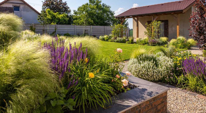 Kombinácia hortenzie kalinolistej a tráv vytvára vyplnenú plochu, ktorá je doplnená ostatnými trvalkami.
